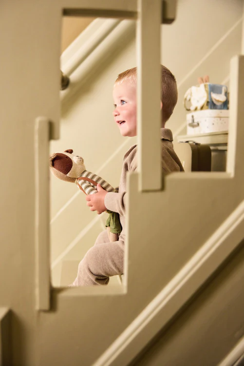 Der weiche, gestrickte Körper macht es besonders kuschelig, und da es aufrecht sitzt, eignet es sich auch super als Deko fürs Kinderzimmer.